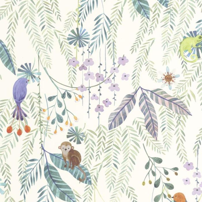 En El Telar de Pastrana, te presentamos el papel pintado Tropical Forest de Casadeco, una opción ideal para llenar de color y aventura la habitación de los niños. Este diseño nos transporta a un mundo exótico, donde exuberante vegetación tropical y coloridos animales de la selva conviven en un vibrante paisaje.